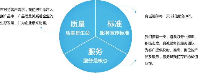 質量是生存之本,服務是生存之道,市場是生命之源;以質量求生存,以服務求發(fā)展!服務理念:以客戶為中心,盡心盡力為客戶服務,客戶滿意是我們不變的承諾